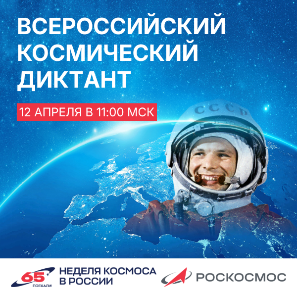 Ежегодная акция, проходящая в виде телемоста центральной площадки с региональными, а также в онлайн-формате. Всероссийский космический диктант состоится 12 апреля в 11:00 по московскому времени.